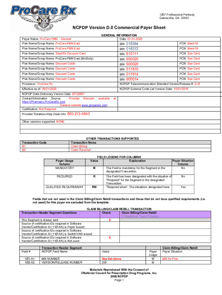 Get the free Ncpdp Version D.0 Commercial Payer Sheet