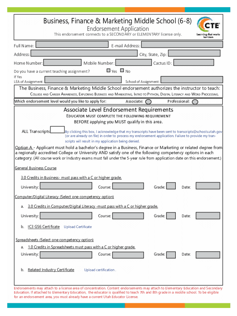 Get the free Business, Finance & Marketing Middle School Endorsement Application - schools utah