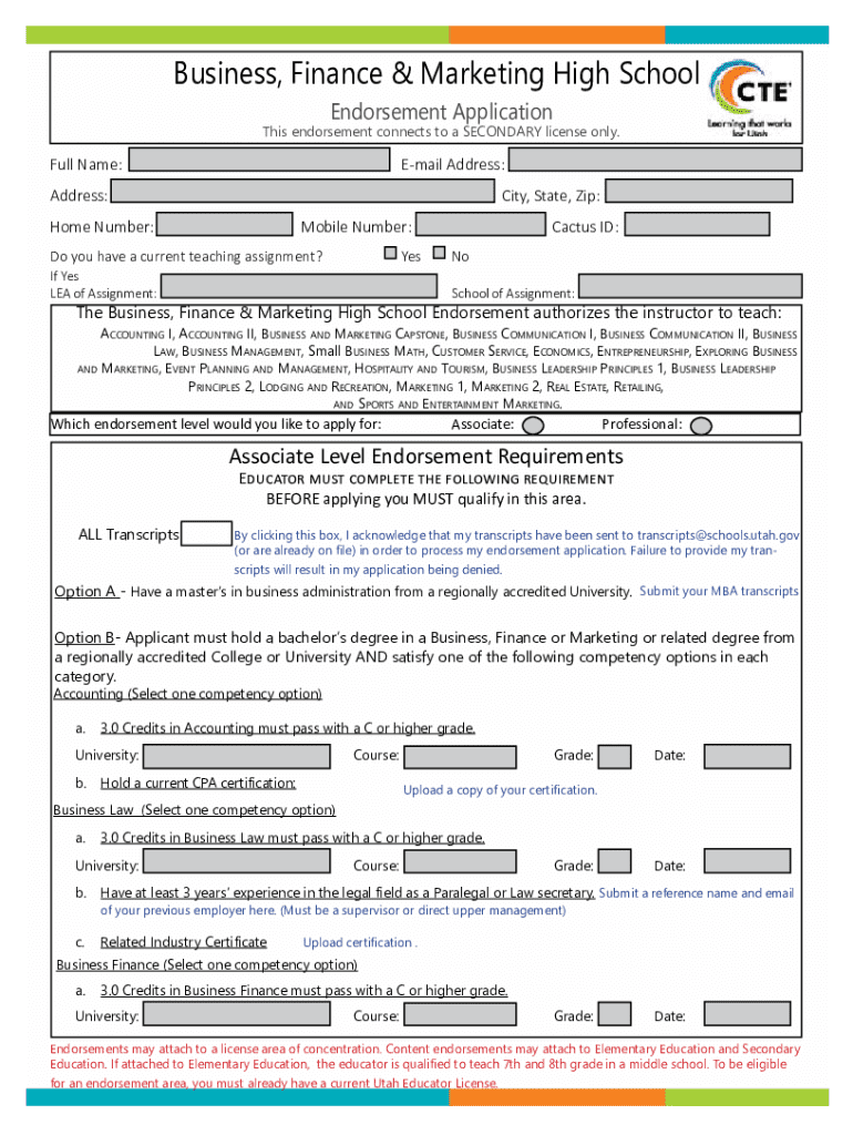 Get the free Business, Finance & Marketing High School Endorsement Application - schools utah