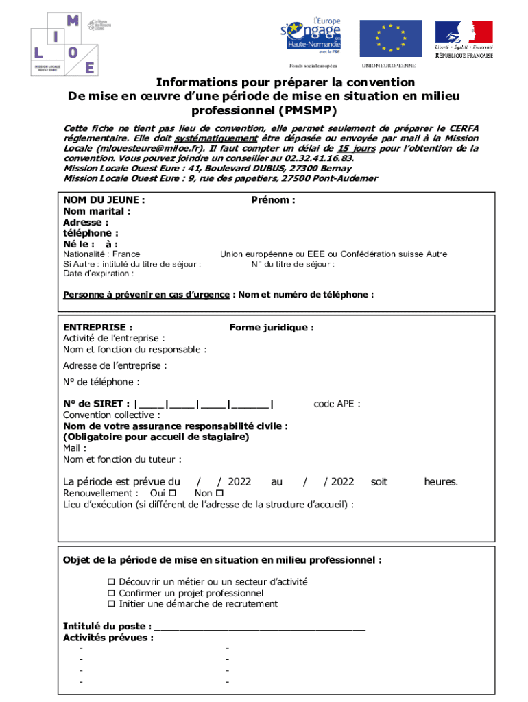 Ce document est destin prparer le CERFA rglementaire pour une priode de mise en situation en milieu professionnel, remettre la Mission Locale.