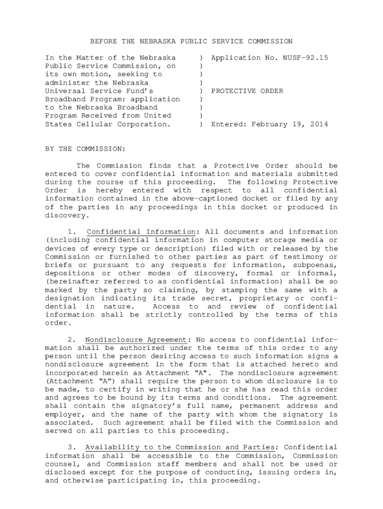 This document outlines the protective order issued by the Nebraska Public Service Commission regarding the confidentiality of certain information submitted during the Nebraska Broadband Program application