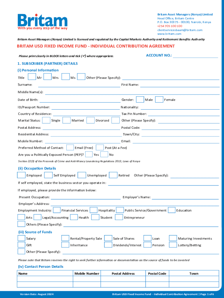 Filling out the Britam USD Fixed Income Form is a straightforward process if approached methodically. Start with Section 1, where personal information is needed. This includes your full name, contact details, and identification numbers. This section serves as the foundation of your application.