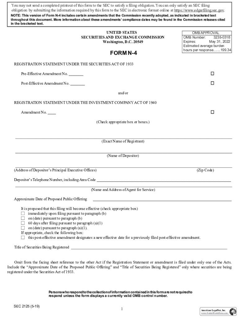 Form N-4 is a tax filing form used in the United States for reporting certain tax information related to non-resident alien (NRA) individuals or entities.