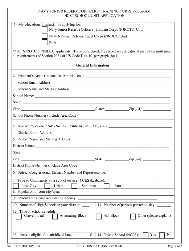 This document is an application for educational institutions seeking to host a Navy Junior Reserve Officers Training Corps (NJROTC) or Navy National Defense Cadet Corps (NNDCC) unit. It provides required