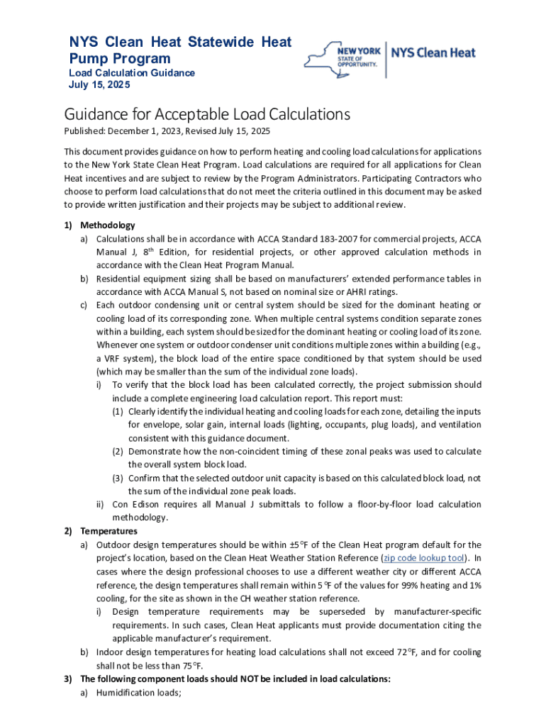 This document provides guidance on how to perform heating and cooling load calculations for applications to the New York State Clean Heat Program, outlining methodologies, temperature requirements,