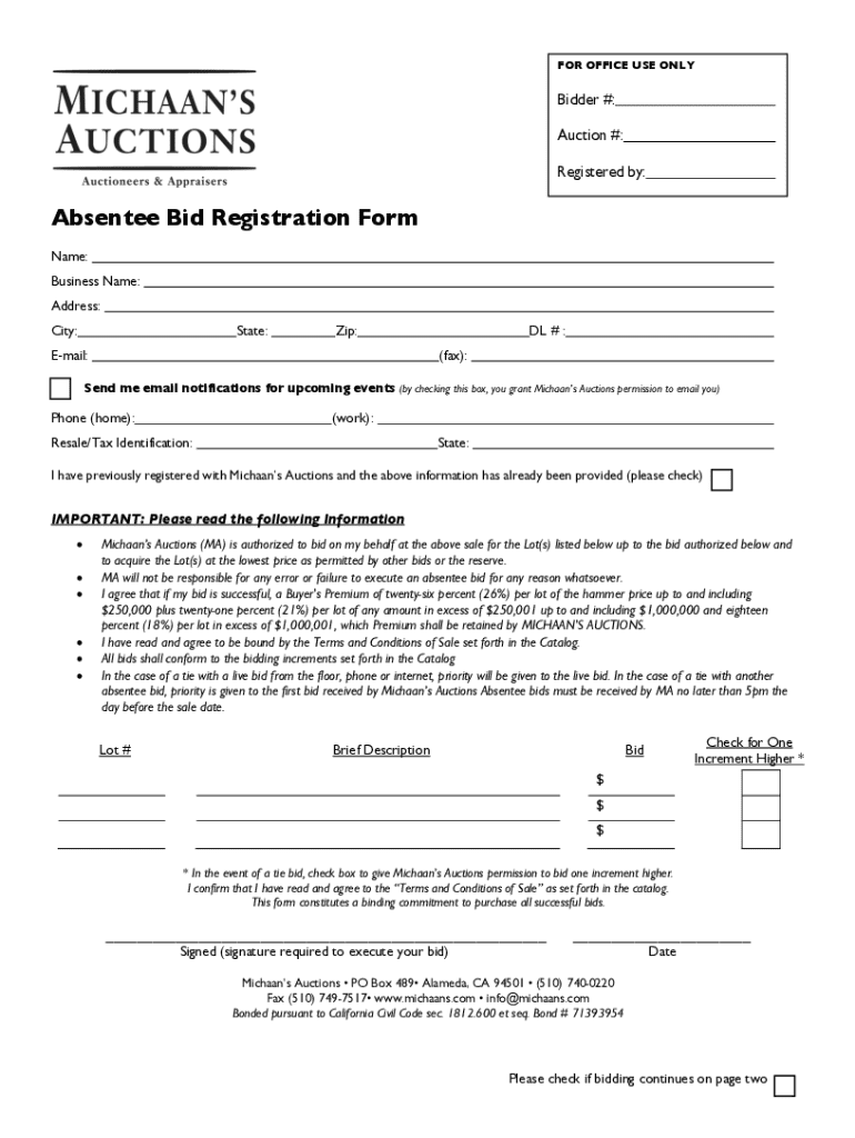 An absentee bid registration form is a document used by individuals who wish to place a bid on an item or property without being physically present at the auction.