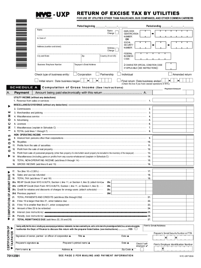 The NYC-UXP form is targeted towards utilities operating within New York City that are subject to excise taxes. Excluded are specific entities like railroads and common carriers. Essentially, any utility, including those managing electricity, gas, or water services, should be knowledgeable about and utilize this form to maintain compliance with local tax laws.
