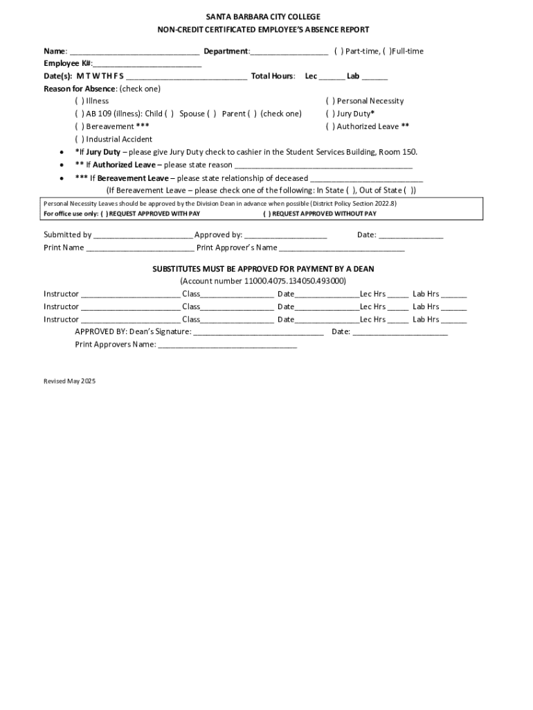 The non-credit certificated employees absence form is a structured document designed to track and manage employee absences. Its primary purpose is to provide an official channel for employees to communicate their absence to their supervisors and the HR department. By using this standardized form, institutions can streamline their absence management processes.