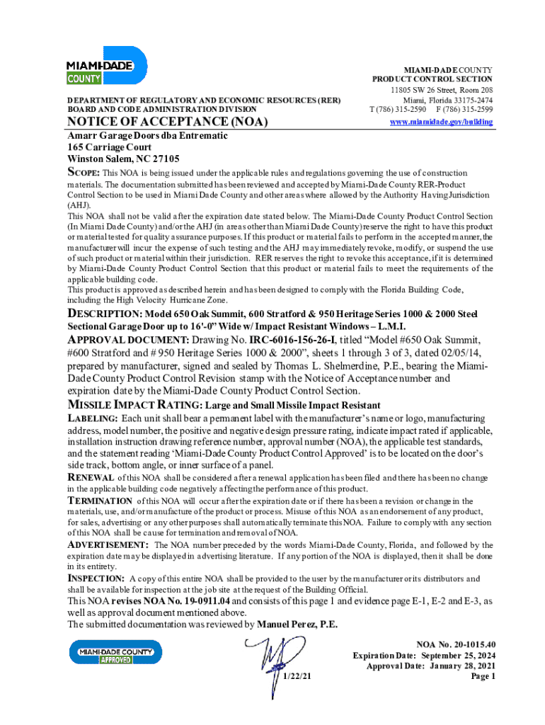 This document serves as an acceptance notice issued by the MiamiDade County Product Control Section for specific construction materials used in MiamiDade County, indicating compliance with the Florida