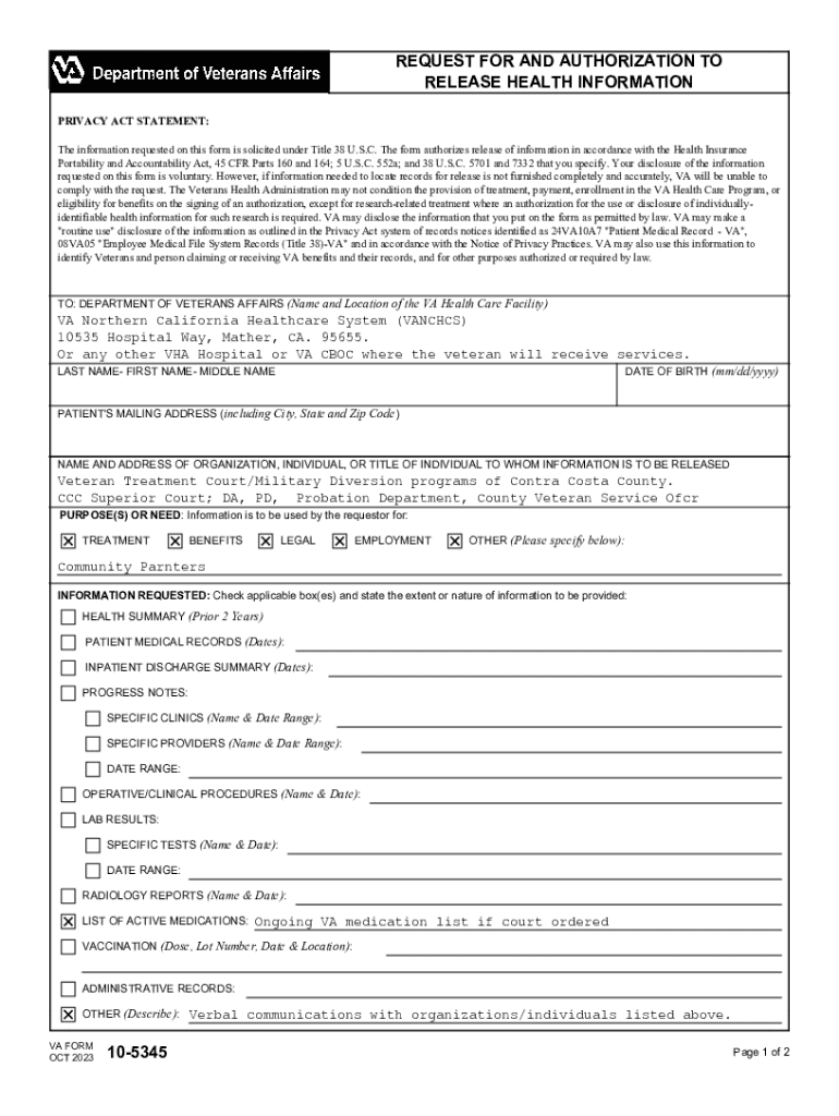 Veterans who wish to obtain or authorize the sharing of their medical records must fill out VA Form 10-5345. Eligibility extends to not only veterans themselves but also their families and authorized representatives who are assisting them in managing their care. The scenarios that warrant the completion of this form include transitioning to a new healthcare provider, seeking specialist care, or obtaining results from recent medical procedures.