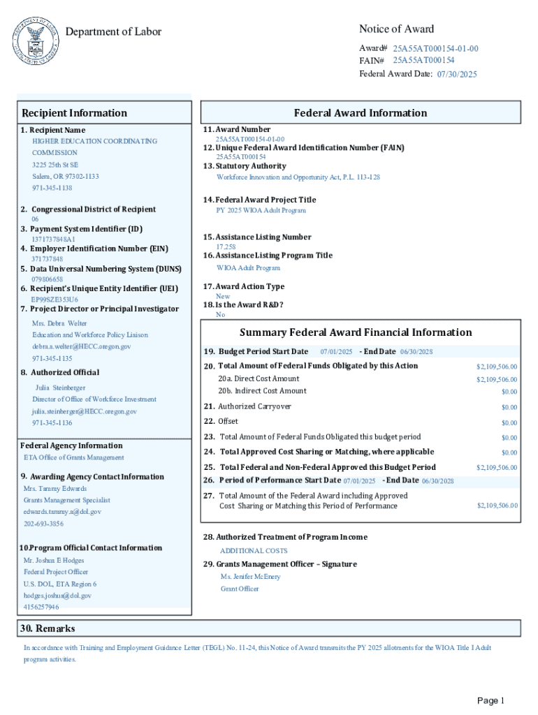 Get the free Notice of Award