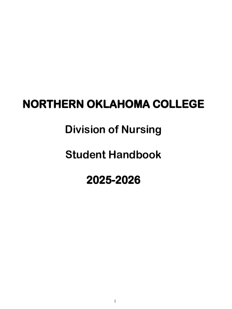The handbook outlines the policies, procedures, and resources pertaining to nursing students at Northern Oklahoma College, including admission requirements, academic integrity, clinical practices,