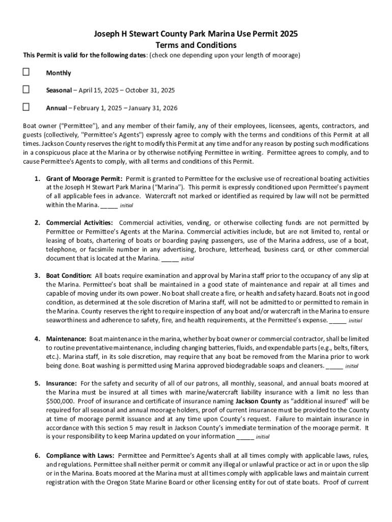 This document outlines the terms and conditions of use for the Joseph H Stewart County Park Marina for permit holders, including moorage options, compliance requirements, and responsibilities.