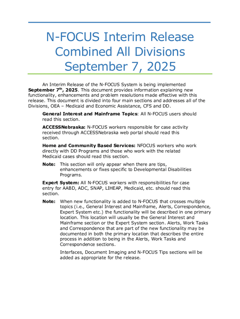 An Interim Release of the NFOCUS System that explains new functionality, enhancements, and problem resolutions effective with this release, divided into four main sections for different divisions.
