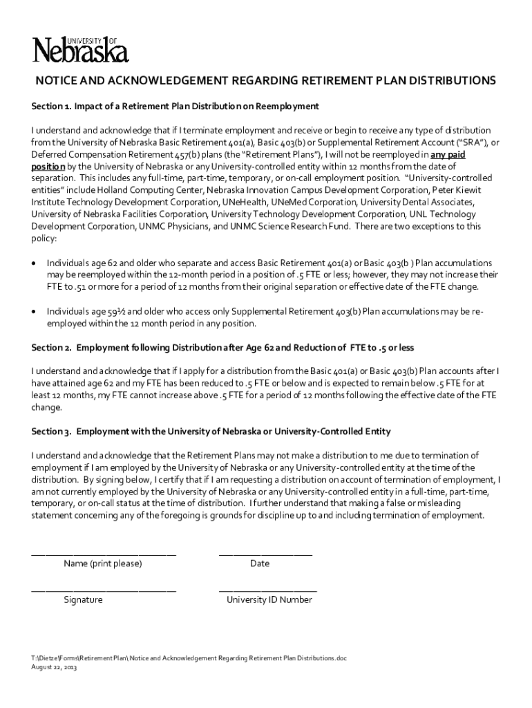 Get the free Notice and Acknowledgement Regarding Retirement Plan Distributions