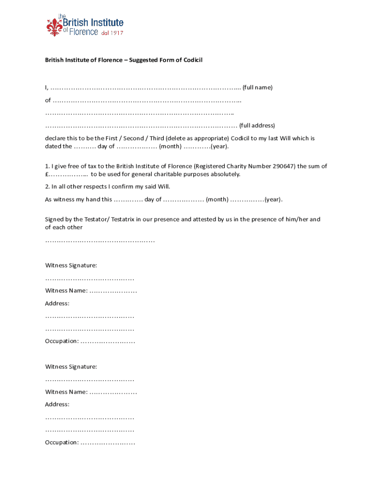 Get the free British Institute of Florence – Suggested Form of Codicil