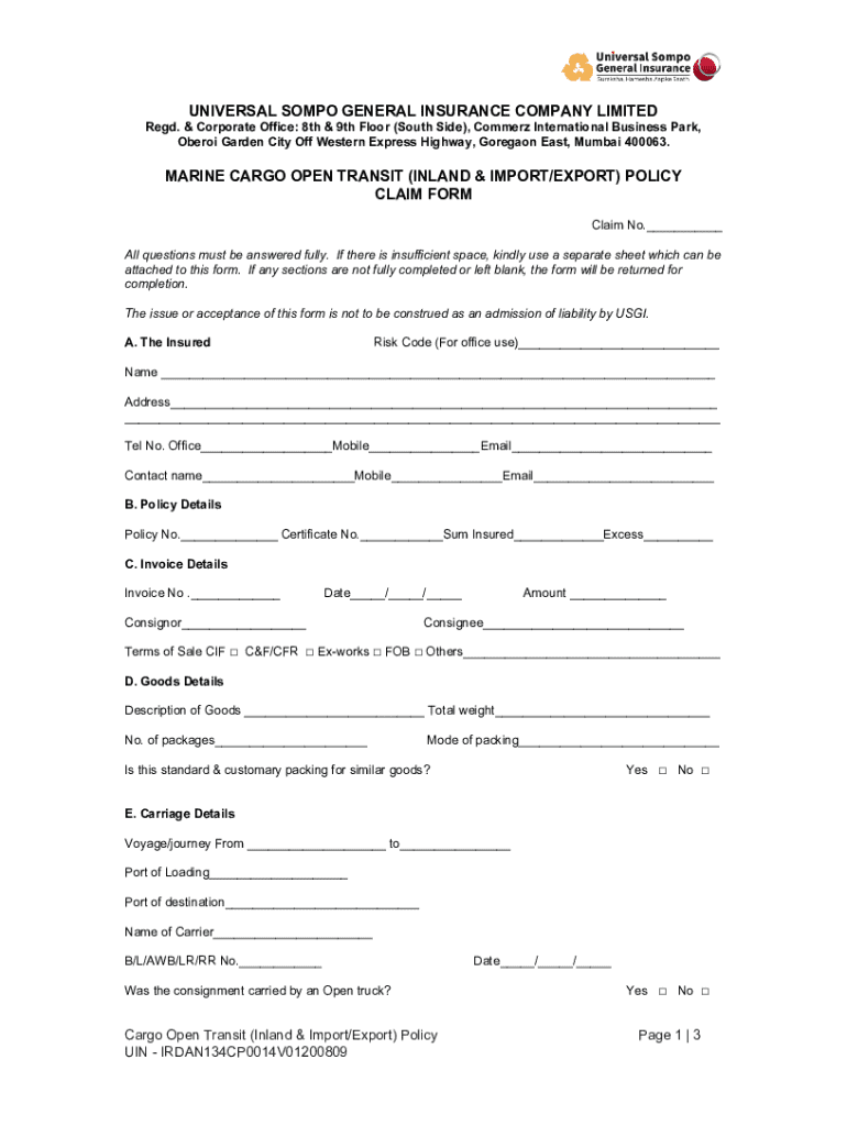Get the free Marine Cargo Open Transit Policy Claim Form