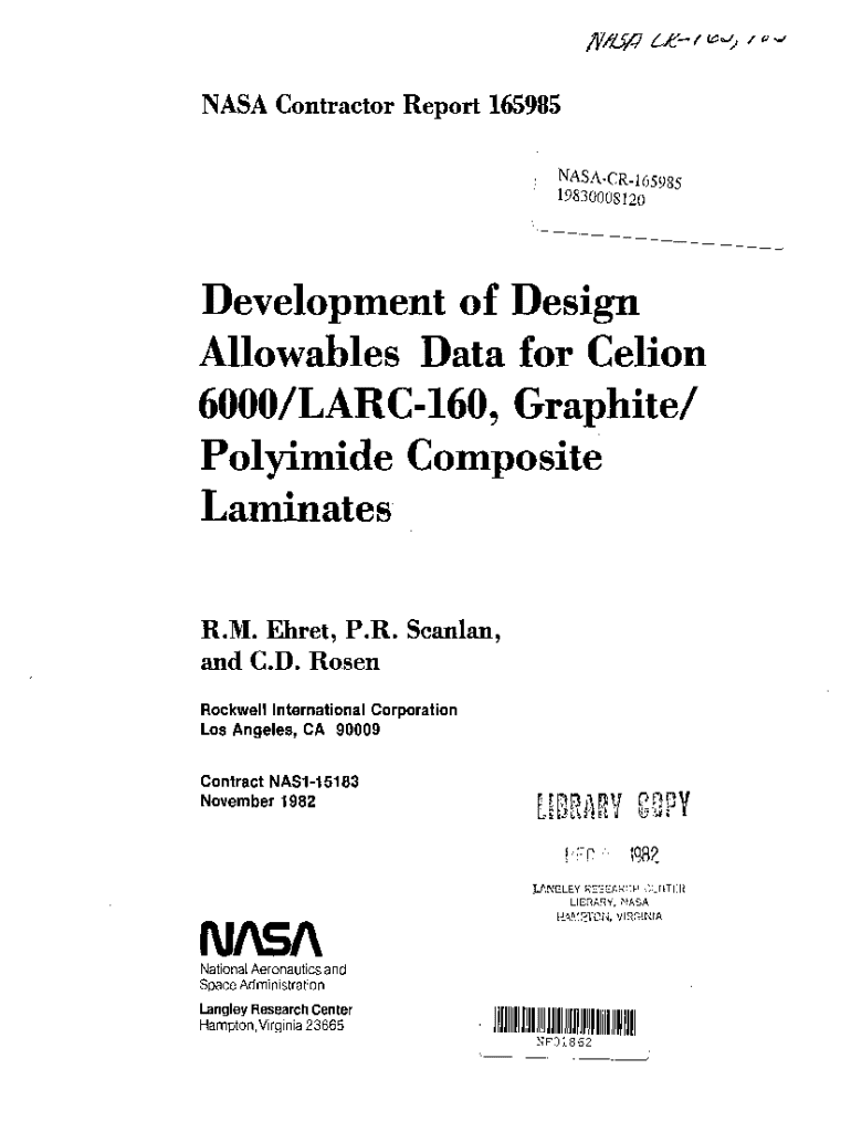This document presents the findings of a design allowables test program conducted on Celion 6000/LARC160 graphite polyimide composite material to determine mechanical properties across a specified