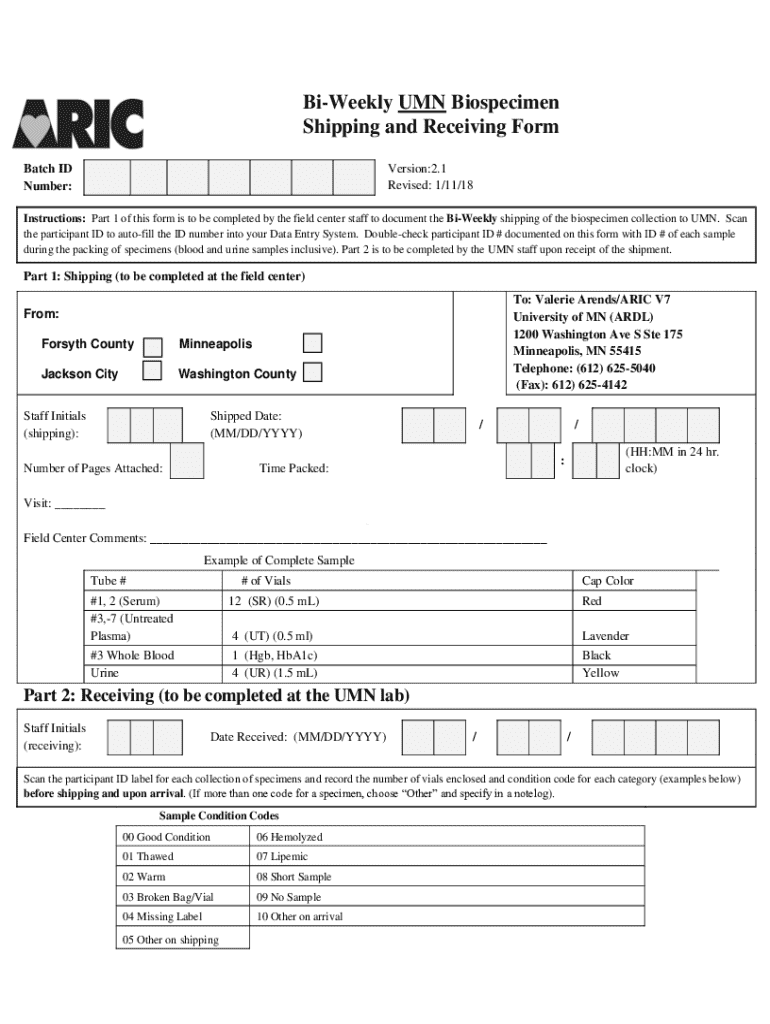Get the free Bi-weekly Umn Biospecimen Shipping and Receiving Form