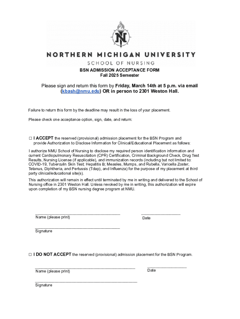 The BSN admission acceptance form is a crucial document that signifies the official entry into a Bachelor of Science in Nursing program. This form is not just a formality; it embodies the culmination of your journey through rigorous application processes and interviews. Recognizing its importance is vital as it not only confirms your acceptance into the program but also triggers subsequent actions that you will need to take for your nursing education.