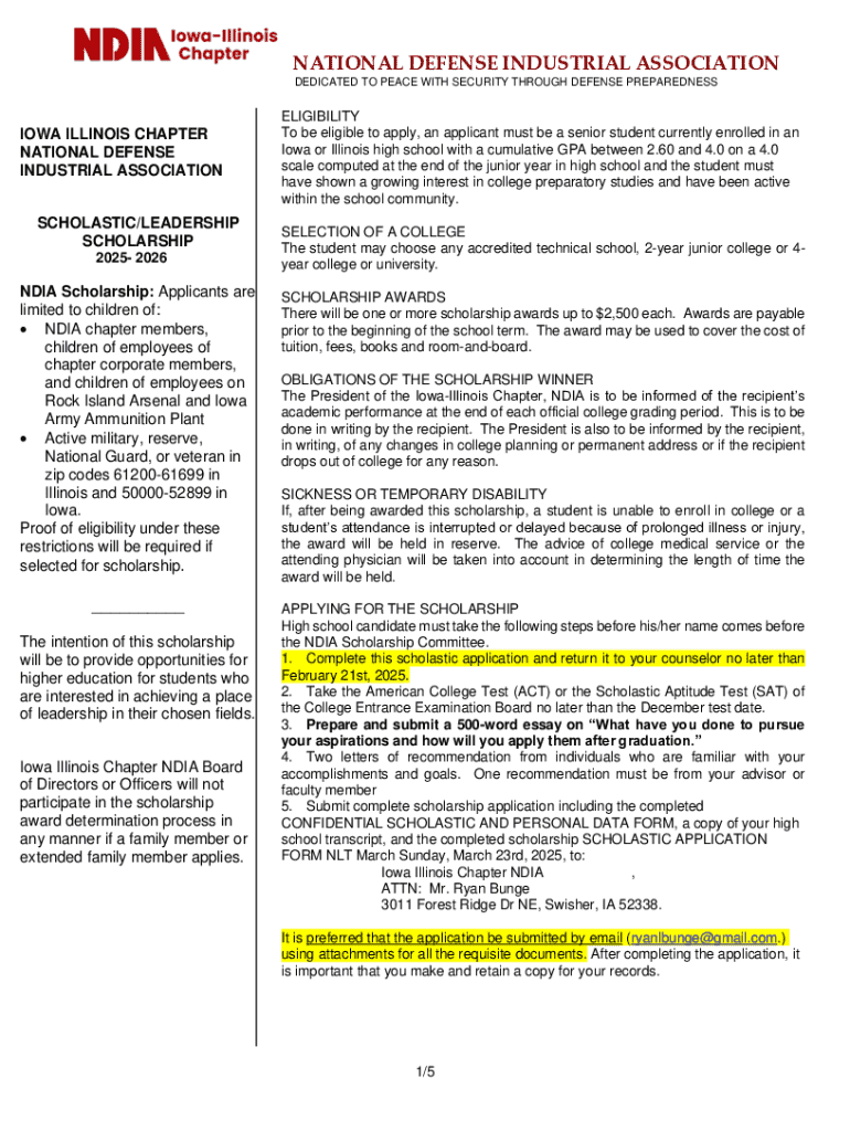 This document outlines the eligibility, application process, and requirements for the NDIA Scholastic/Leadership Scholarship for students in Iowa and Illinois seeking higher education opportunities.