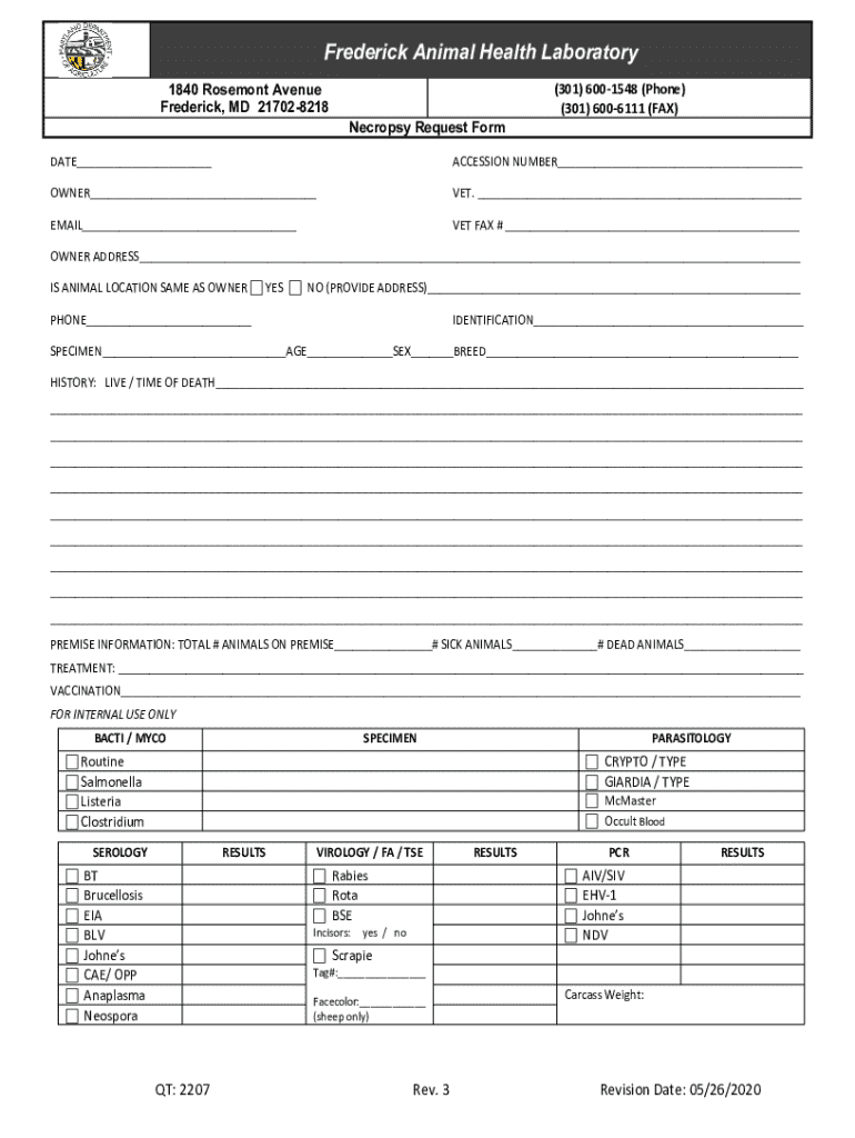 A necropsy request form is a crucial document used in veterinary practices, research institutions, and animal healthcare to formally request the examination of an animal after its death. This examination, conducted by a veterinary pathologist, provides insight into the cause of death, contributing to the knowledge of disease processes and health management. The importance of this form cannot be understated, as it ensures that all essential information is collected and protects the legal and ethical considerations surrounding the investigation of death.