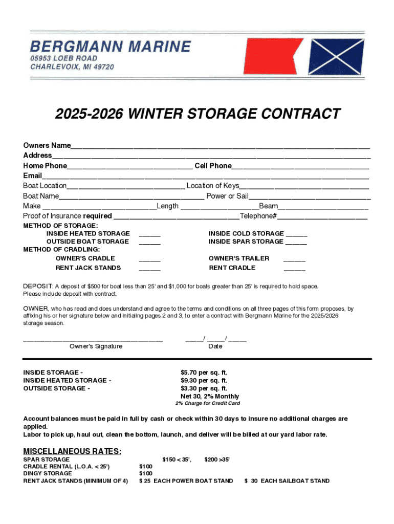 This document serves as a contract for boat owners to secure winter storage for their boats, detailing terms, conditions, payment, and responsibilities of both the owner and Bergmann Marine.