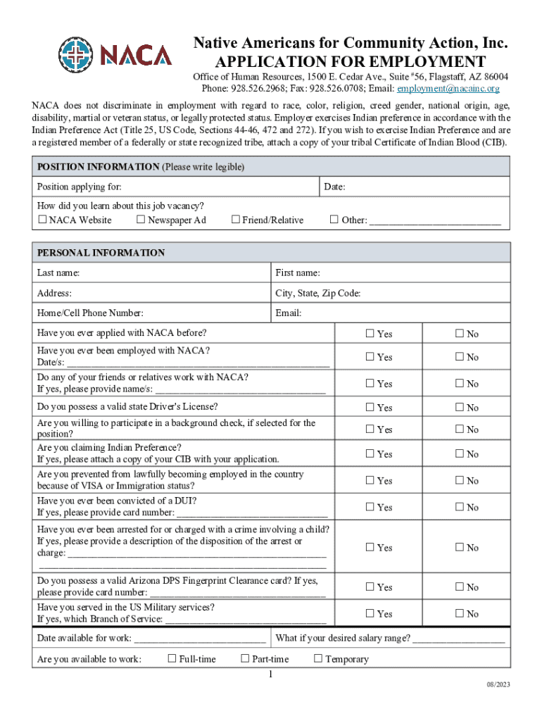 This document is an employment application for candidates seeking to apply for a position at Native Americans for Community Action, Inc., detailing personal information, employment history, and qualifications.