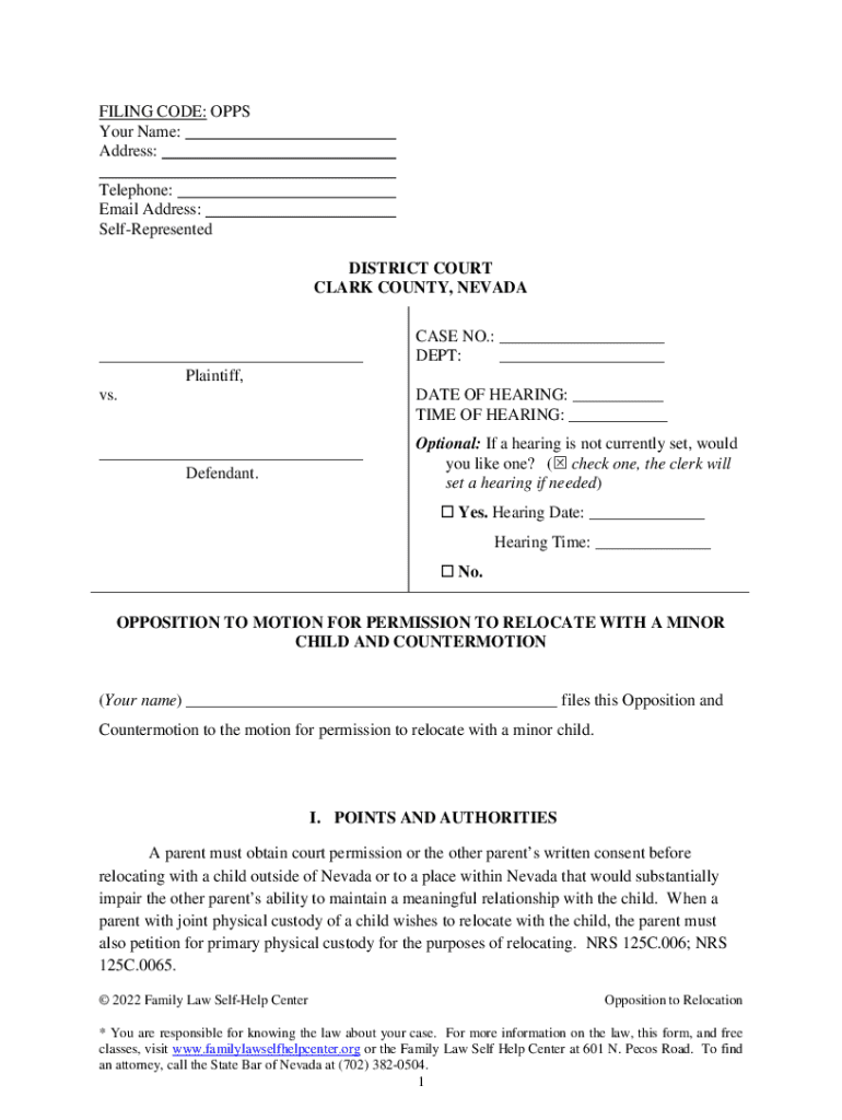 NV Opposition to Motion for Permission to Relocate with a Minor Child and Countermotion - Clark County 2022-2026 free printable template