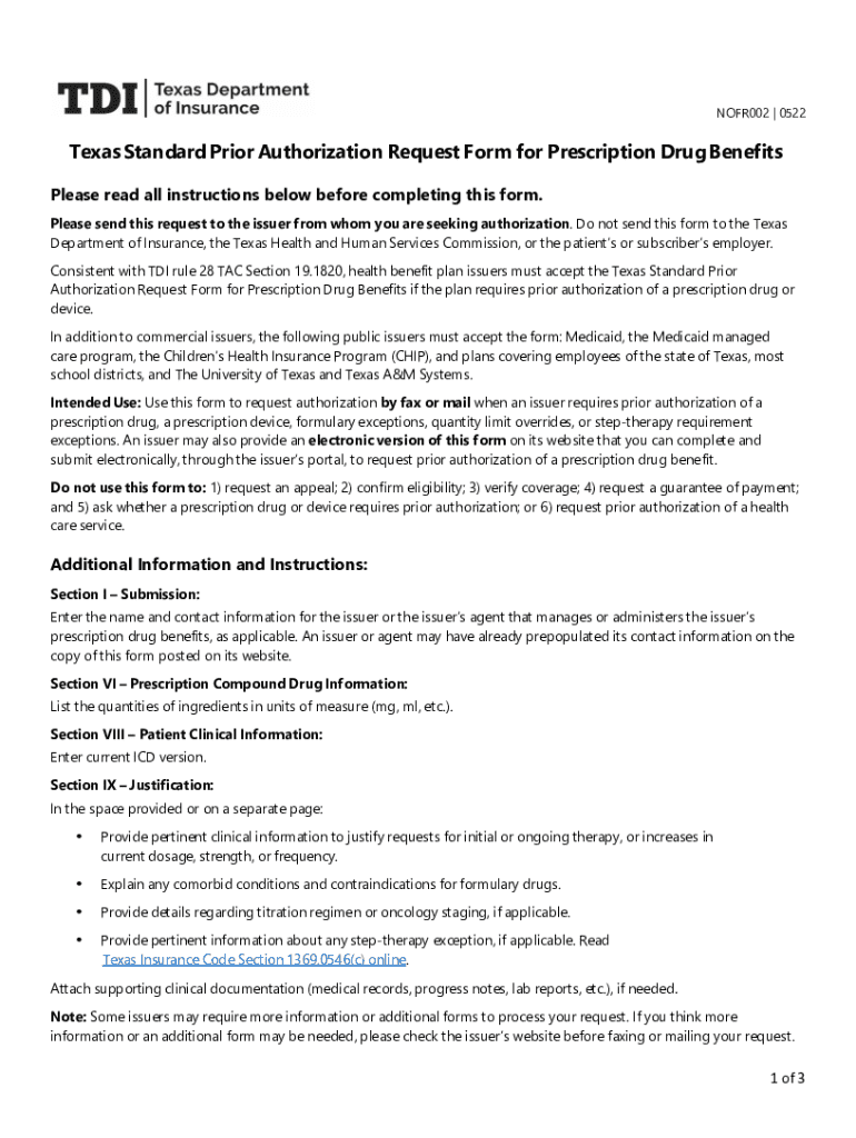 Este formulario se utiliza para solicitar autorizacin para beneficios de medicamentos recetados cuando es necesario obtener una autorizacin previa. Puede ser enviado por fax o correo cuando un emisor