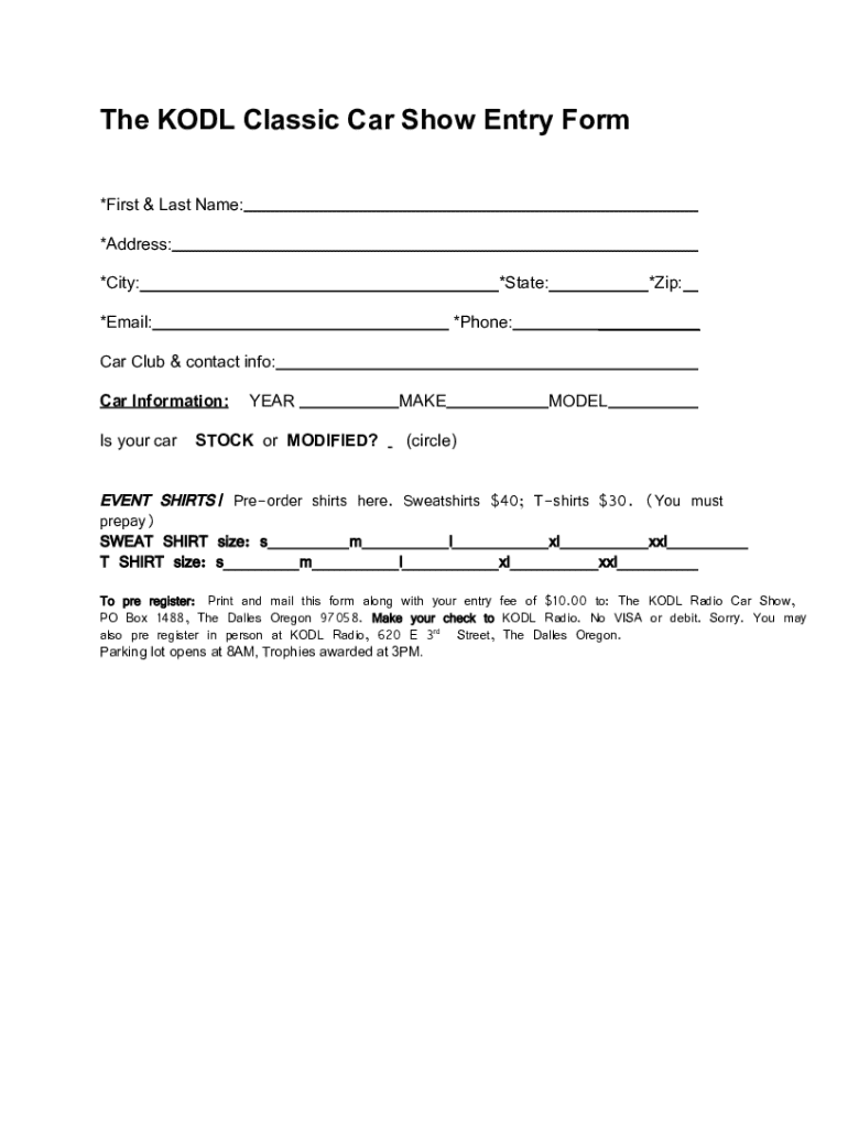 The significance of the KODL Classic Car Show form cannot be overstated. This form serves as an essential gateway for automobile owners seeking to display their prized possessions at the event. By completing this form, participants effectively communicate their details, preferences, and requirements, ensuring a smooth and organized entry to the show that benefits attendees and organizers alike.