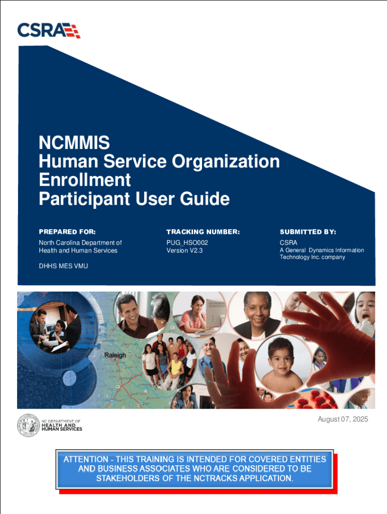 This document serves as a user guide for participants completing the Human Service Organization provider enrollment application in the NCTracks Provider Portal.