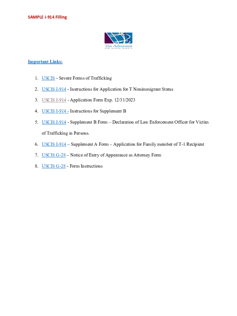 The document provides a sample filling of Form I914, which is used for individuals applying for T nonimmigrant status as victims of human trafficking. It includes important links, detailed explanations