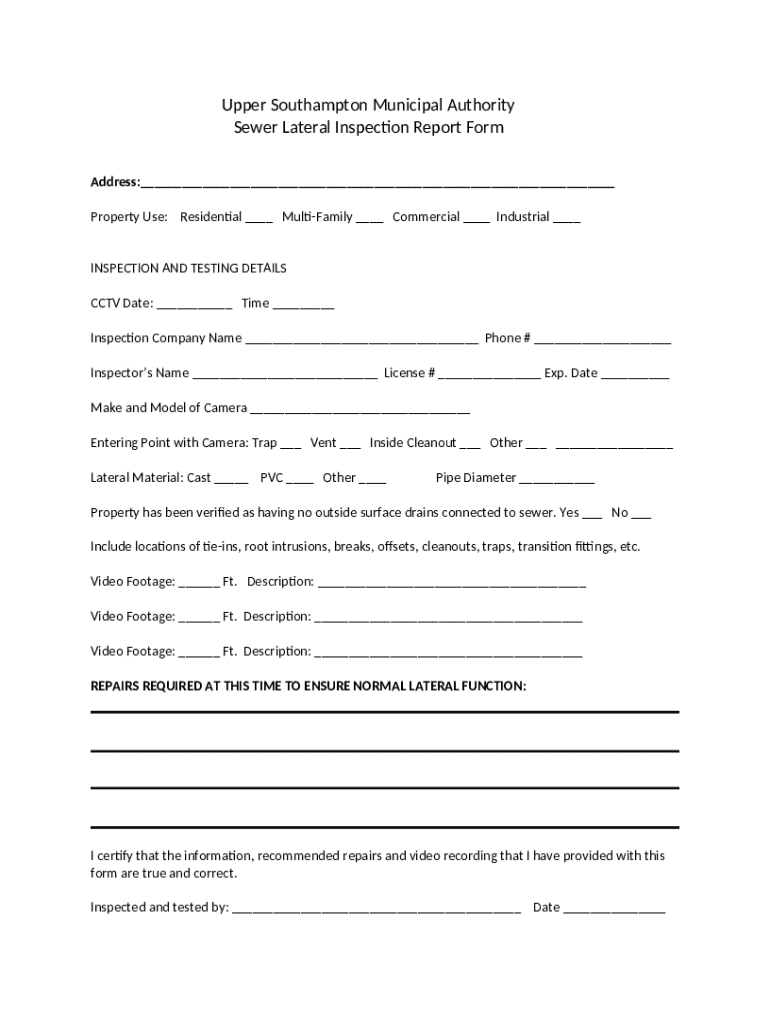 The sewer lateral inspection report form provides a structured way to document the findings of the inspection. Understanding the form's structure is paramount. Typically, it includes key sections such as property information, inspection findings, and recommendations for any necessary repairs or follow-ups. Familiarizing yourself with the terminology used allows for accurate and effective documentation.
