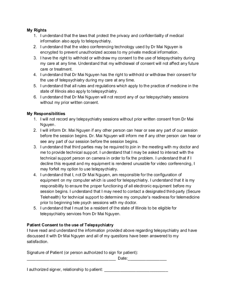 Get the free Patient Information and Consent Form for Telepsychiatry