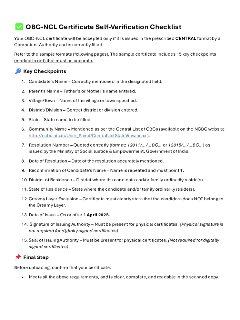 Your Guide to the OBC-NCL Certificate Self-Verification Checklist Form