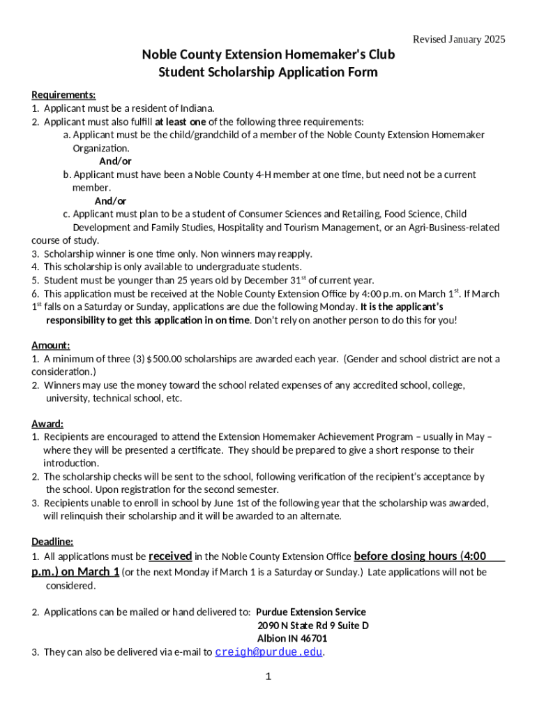 Instructions for the form Noble County Extension Homemaker's Club Student Scholarship Application - extension purdue