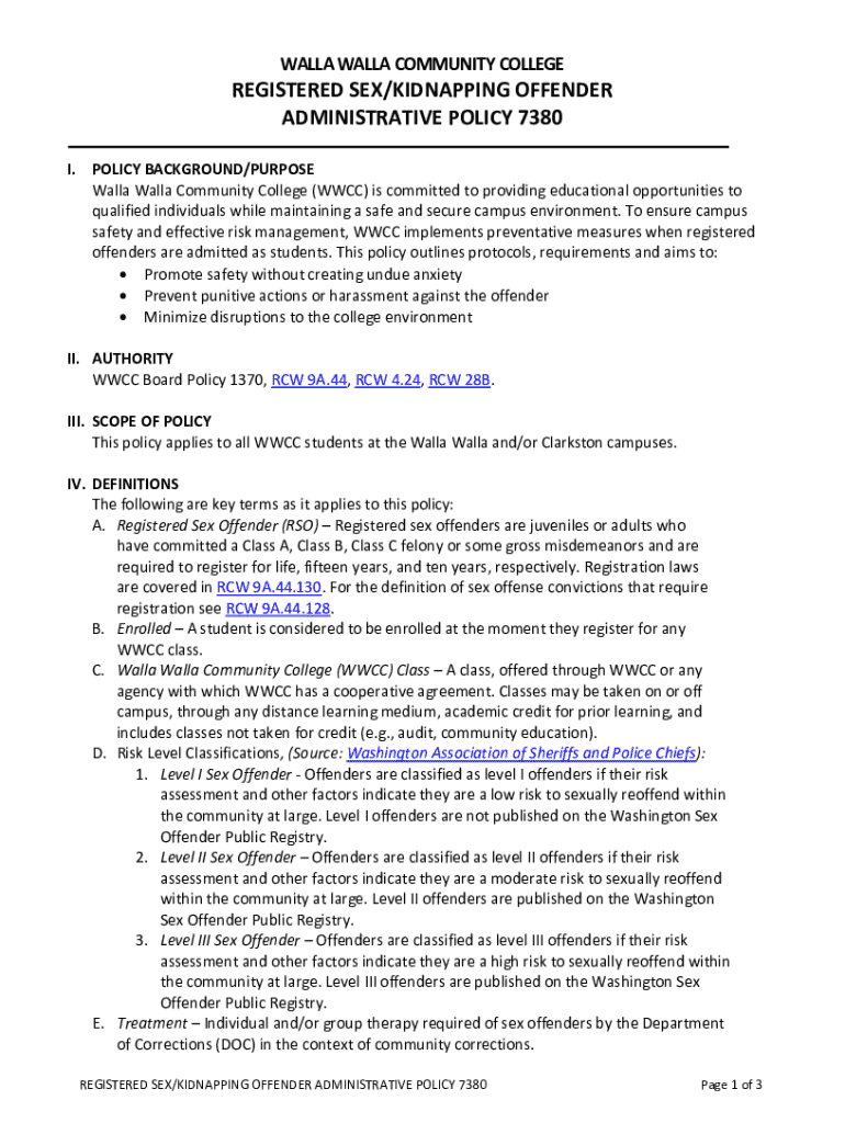 This document outlines the policies and procedures of Walla Walla Community College regarding the enrollment and management of registered sex and kidnapping offenders in order to maintain campus safety