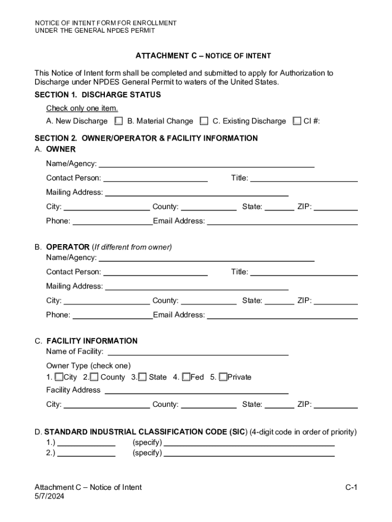A notice of intent form is a document submitted to inform relevant authorities about an individual's or organization's intention to undertake a specific action, such as starting a business, applying for a permit, or initiating a project that may affect the environment.