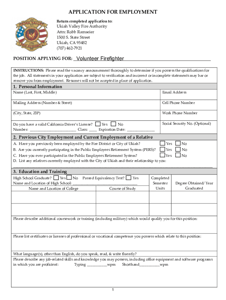 This document is an application form for candidates applying for the Volunteer Firefighter position at the Ukiah Valley Fire Authority, outlining personal information, work experience, education,