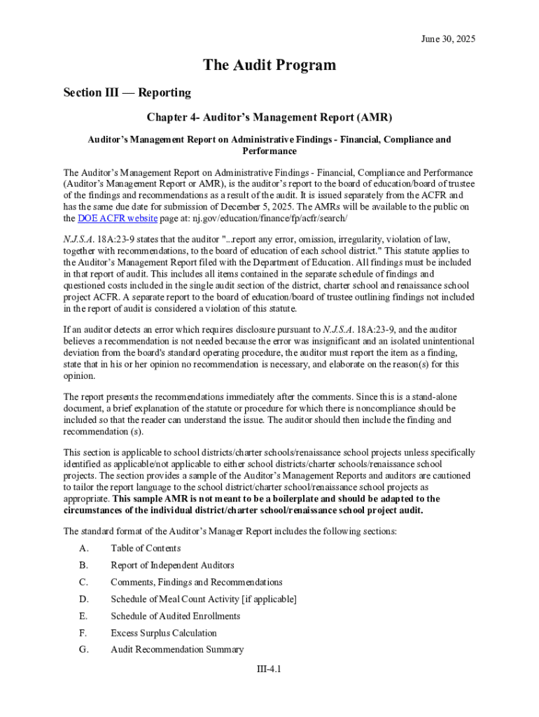 This document serves as the auditor\'s management report detailing administrative findings regarding financial, compliance, and performance aspects of school districts, charter schools, and renaissance