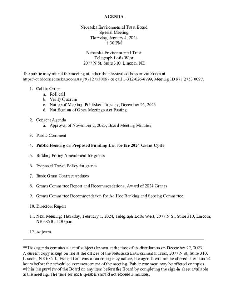 Get the free Nebraska Environmental Trust Board Special Meeting Agenda