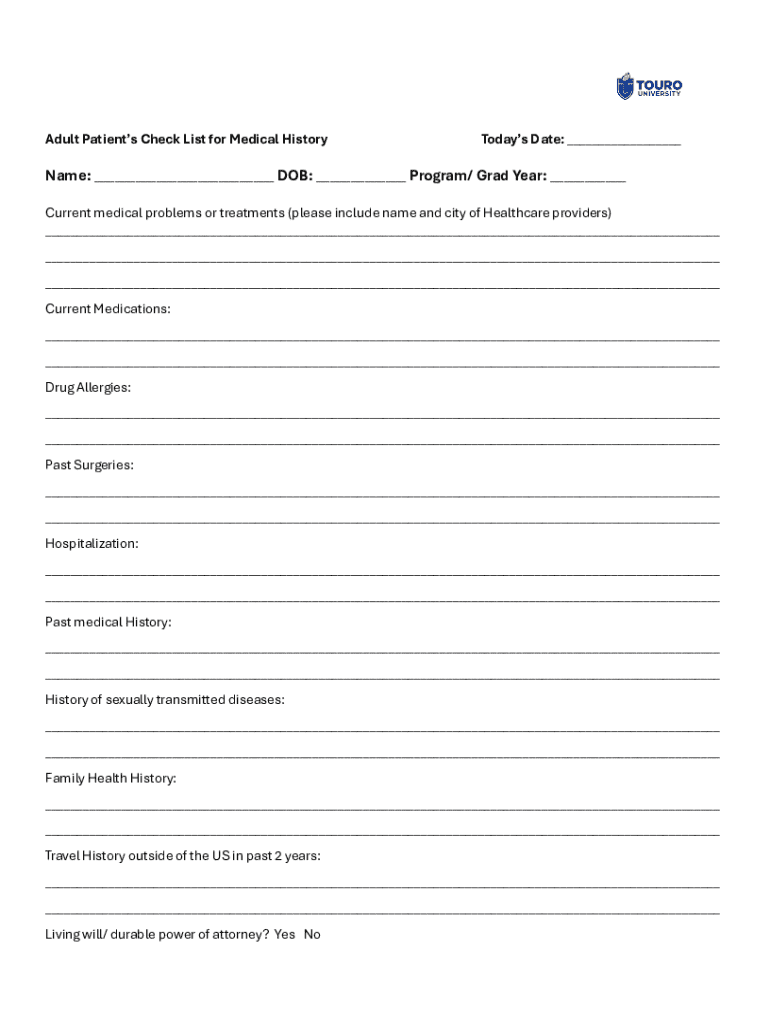 The checklist is structured to capture essential aspects of a patient's health history and current state. Its relevance cannot be overstated, particularly in a time when healthcare systems are increasingly focused on patient-centered care. This allows for a more streamlined interaction and less time spent on administrative tasks, providing more time for meaningful healthcare discussions.