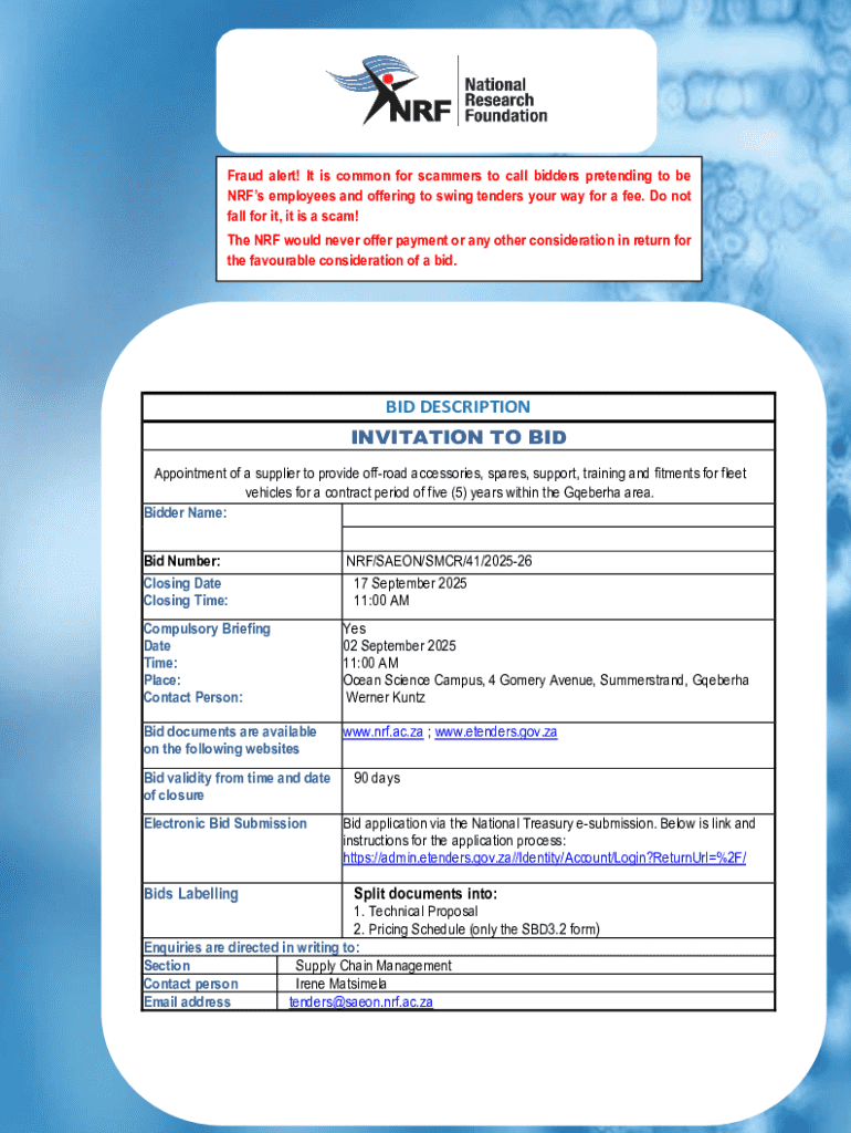 This document serves as a bid invitation for suppliers to provide offroad accessories, spares, support, training, and fitments for fleet vehicles in the Gqeberha area for a contract period of five