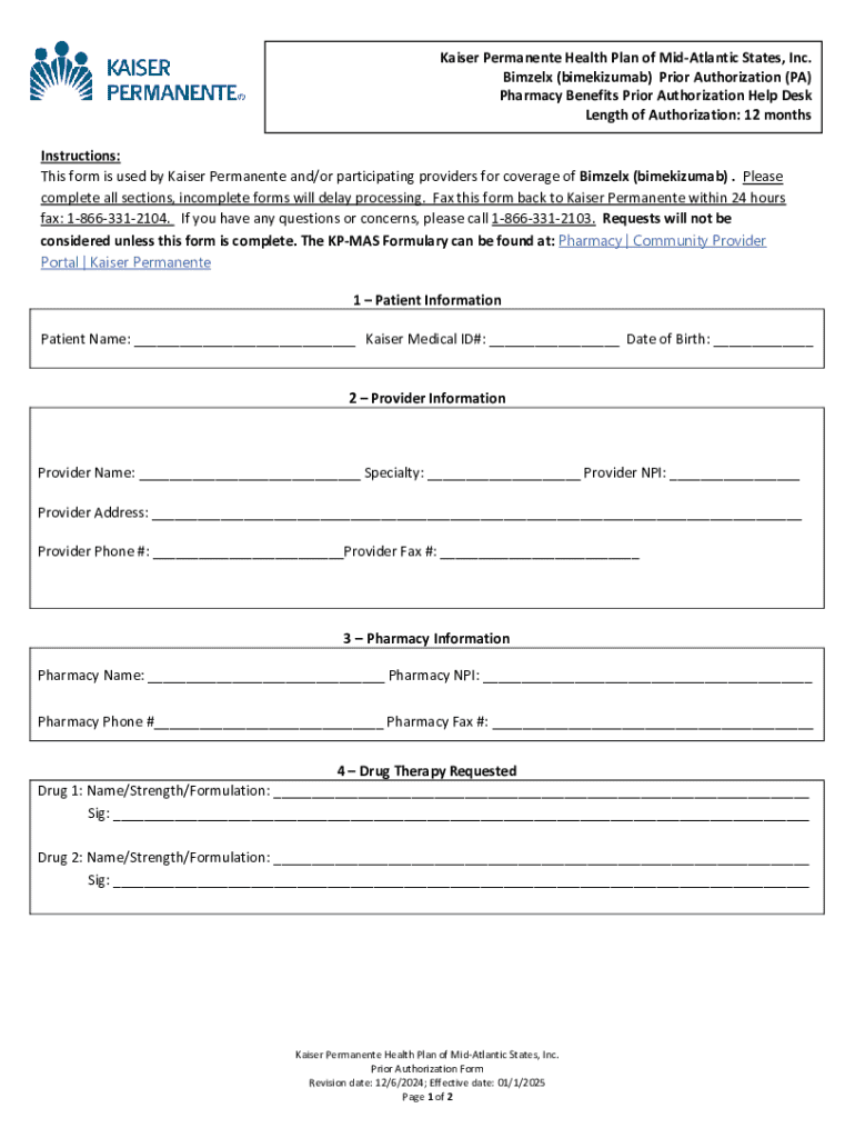 This form is used for requesting prior authorization for coverage of Bimzelx (bimekizumab) by Kaiser Permanente and participating providers.