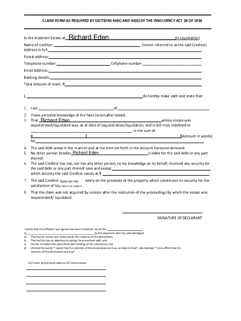 Instructions for completing the claim form as required by the Insolvency Act 24 of 1936, detailing the necessary information and documents to be submitted by creditors in the case of insolvency or