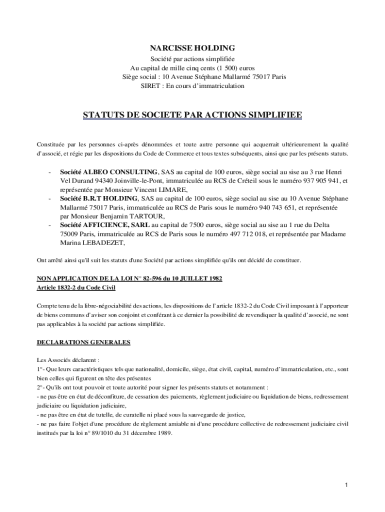 Ce document constitue les statuts de la socit NARCISSE HOLDING, une socit par actions simplifie, dcrivant sa cration, son fonctionnement, ses objectifs, ainsi que les obligations et droits des associs.