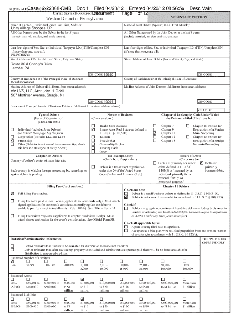 The Case 12-22068-CMB form is structured into several critical sections, each designed to capture specific information necessary for processing the bankruptcy case effectively. A detailed breakdown of these sections can aid users in navigating the form with confidence.