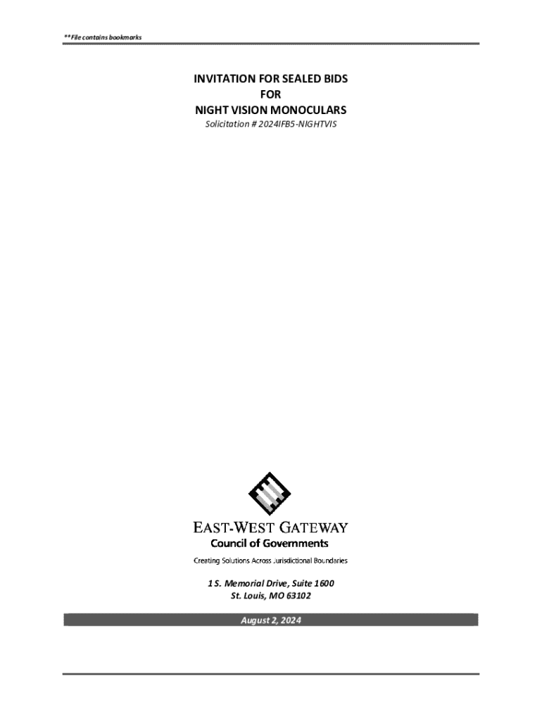 The document is a formal invitation for sealed bids for acquiring 56 night vision monoculars for law enforcement, detailing bid specifications and submission requirements.