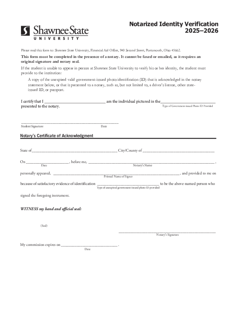 This document is used to verify the identity of a student in the presence of a notary, requiring an original signature and notary seal.